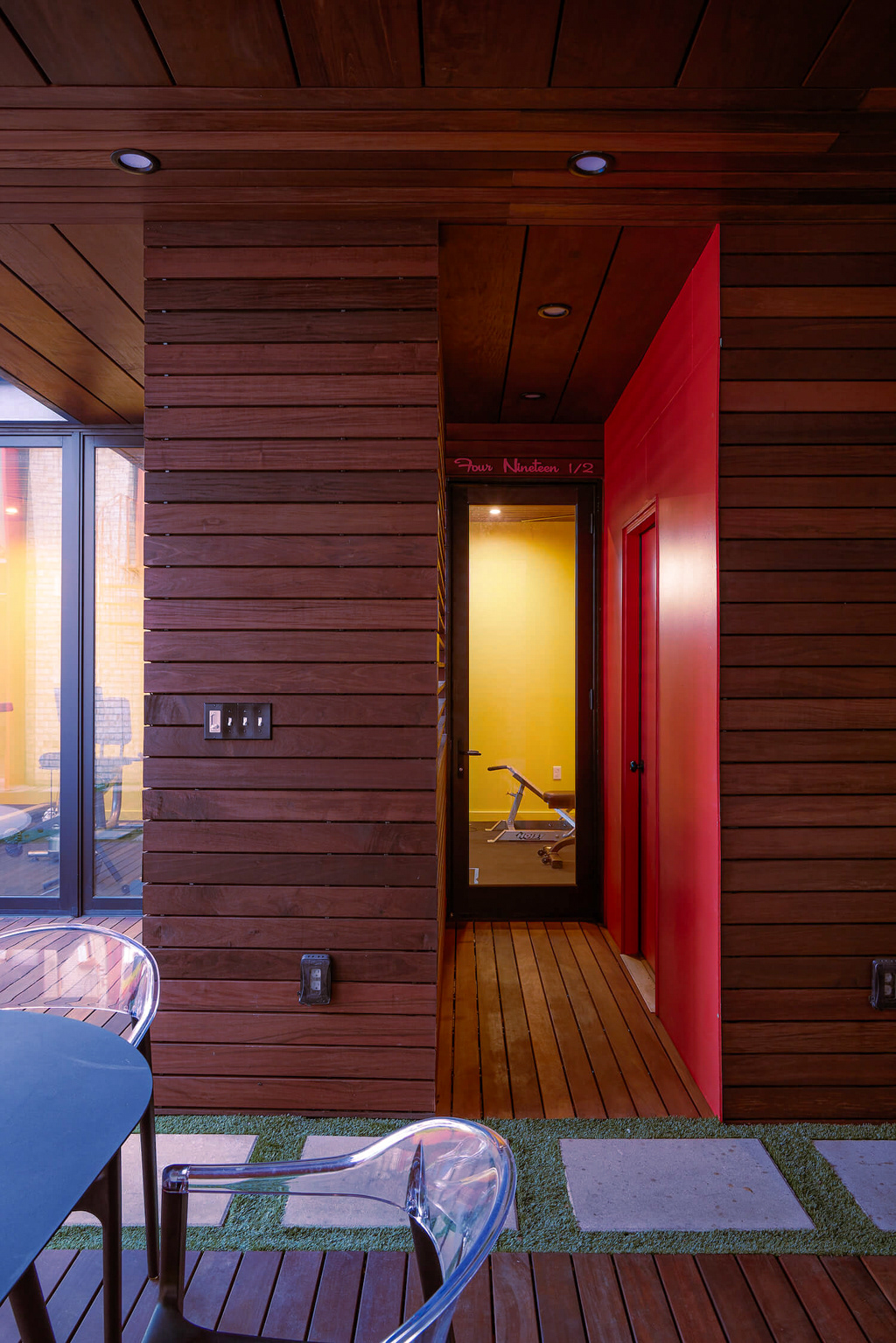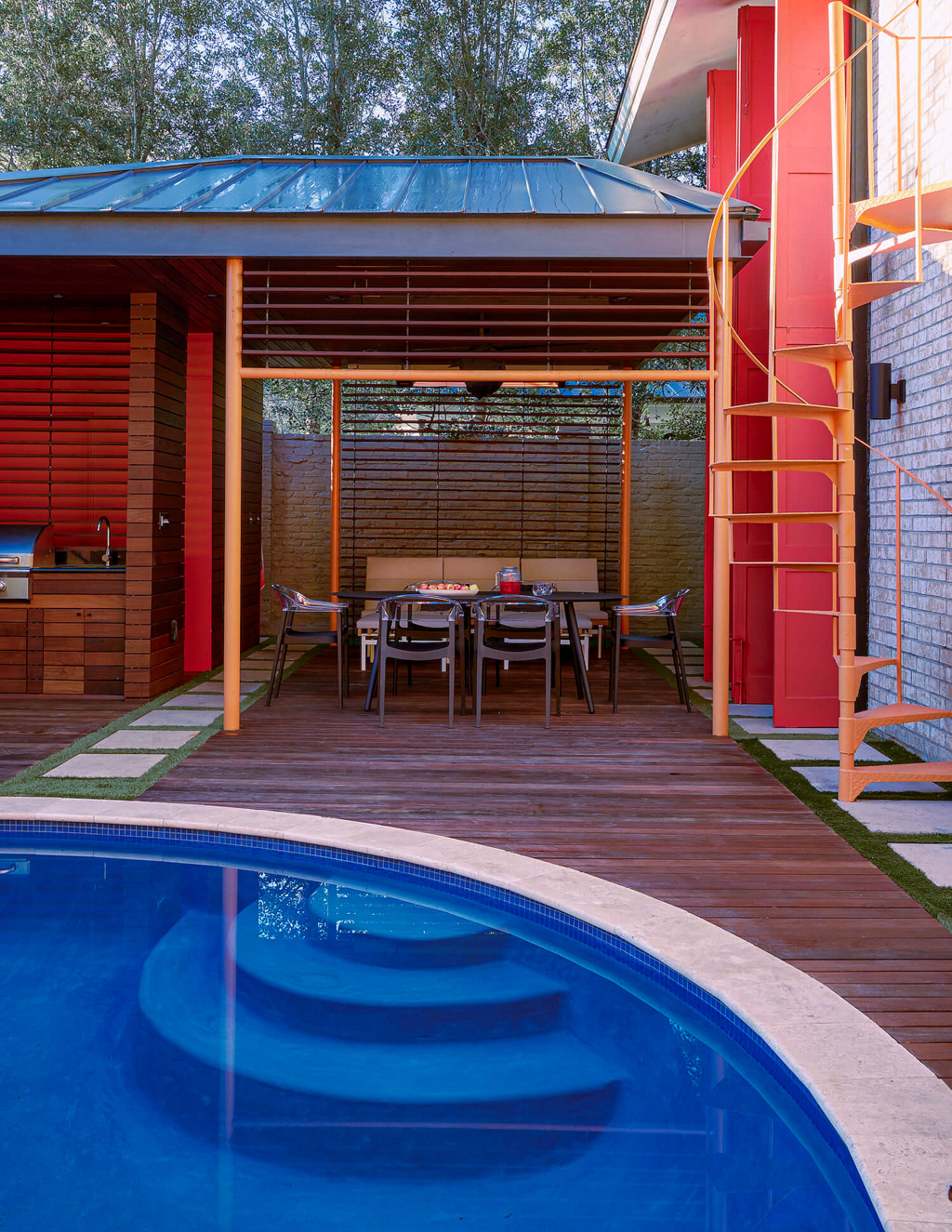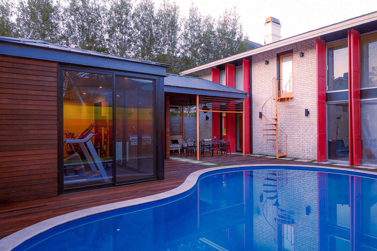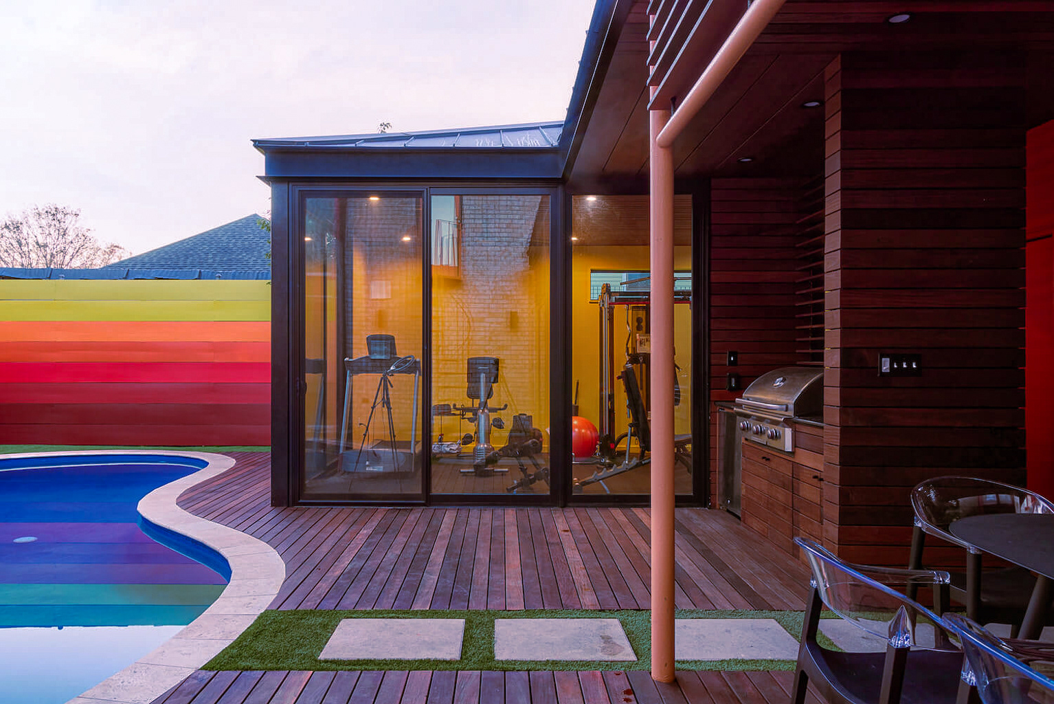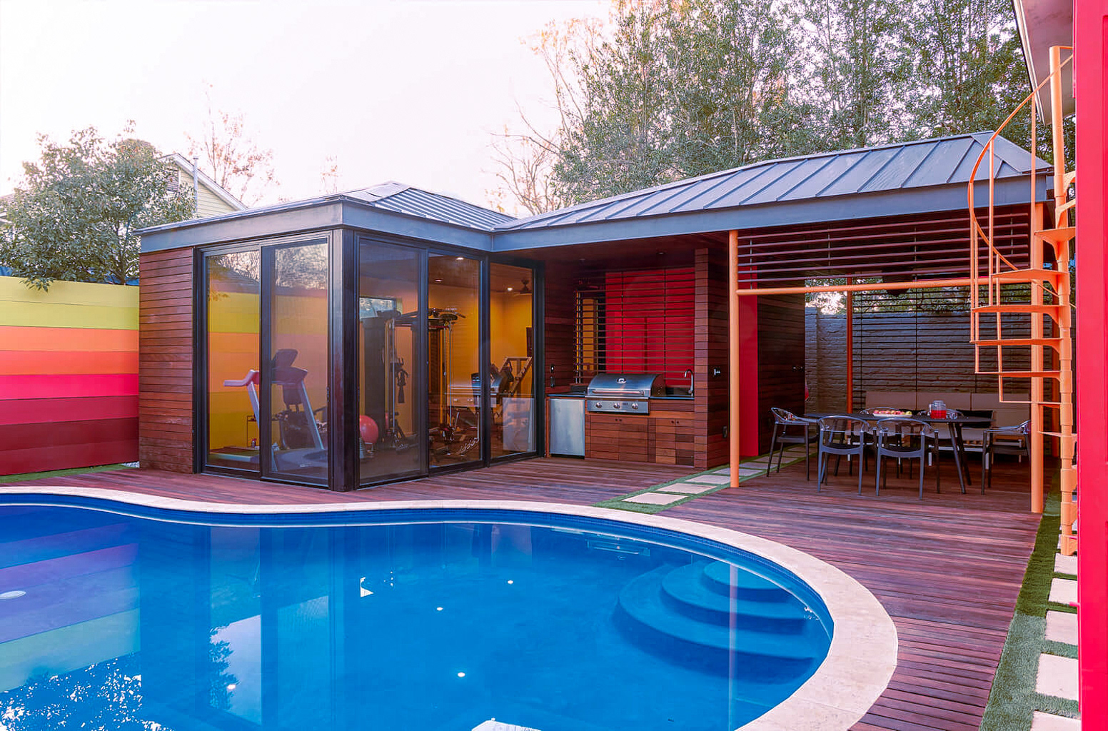 A dedicated bodybuilder and her husband wanted to create space for fitness and leisure as part of an extension to their mid-century modern home. The project’s goal was to maximize use of the backyard by providing a large gym, outdoor lounge space and outdoor kitchen. Bold colors are used in coordination with wood to express functional elements of both the existing home and cabana.