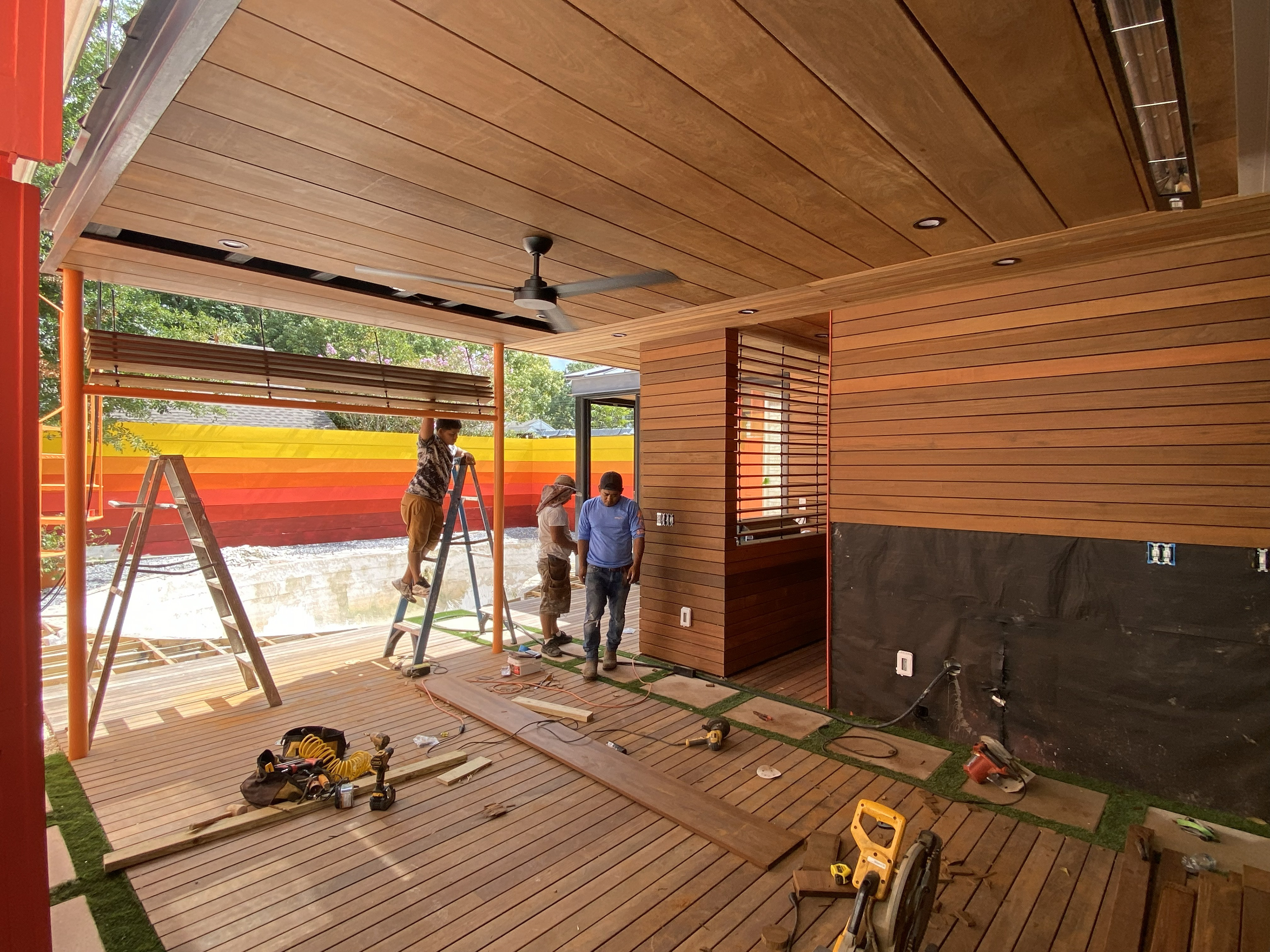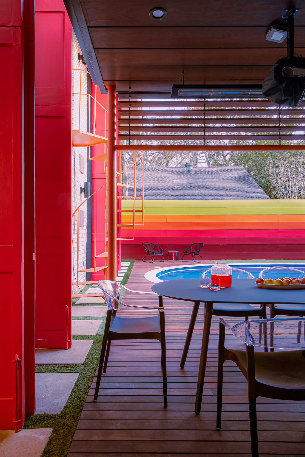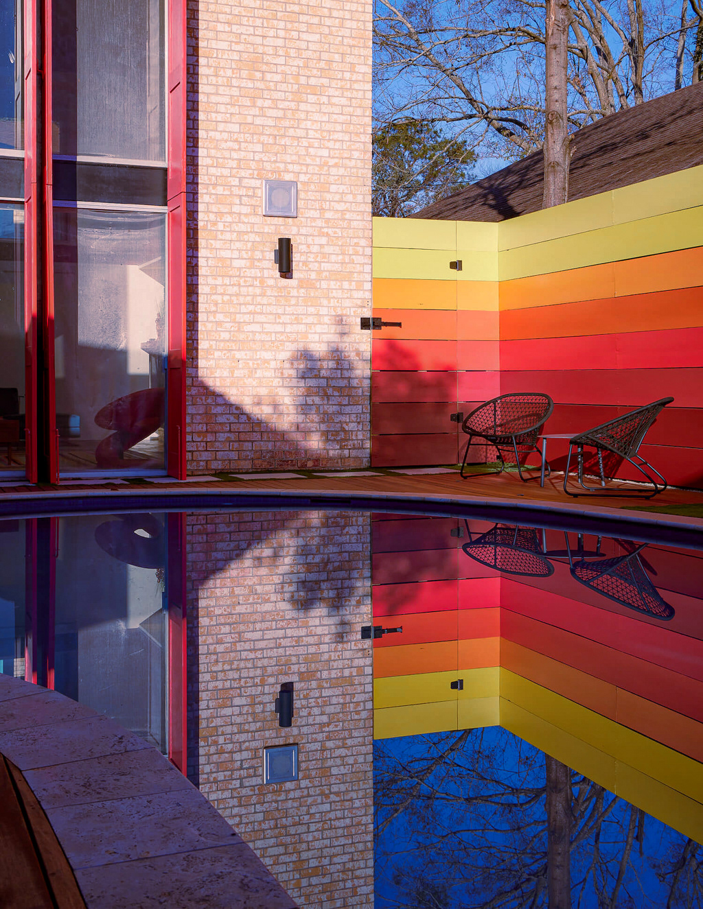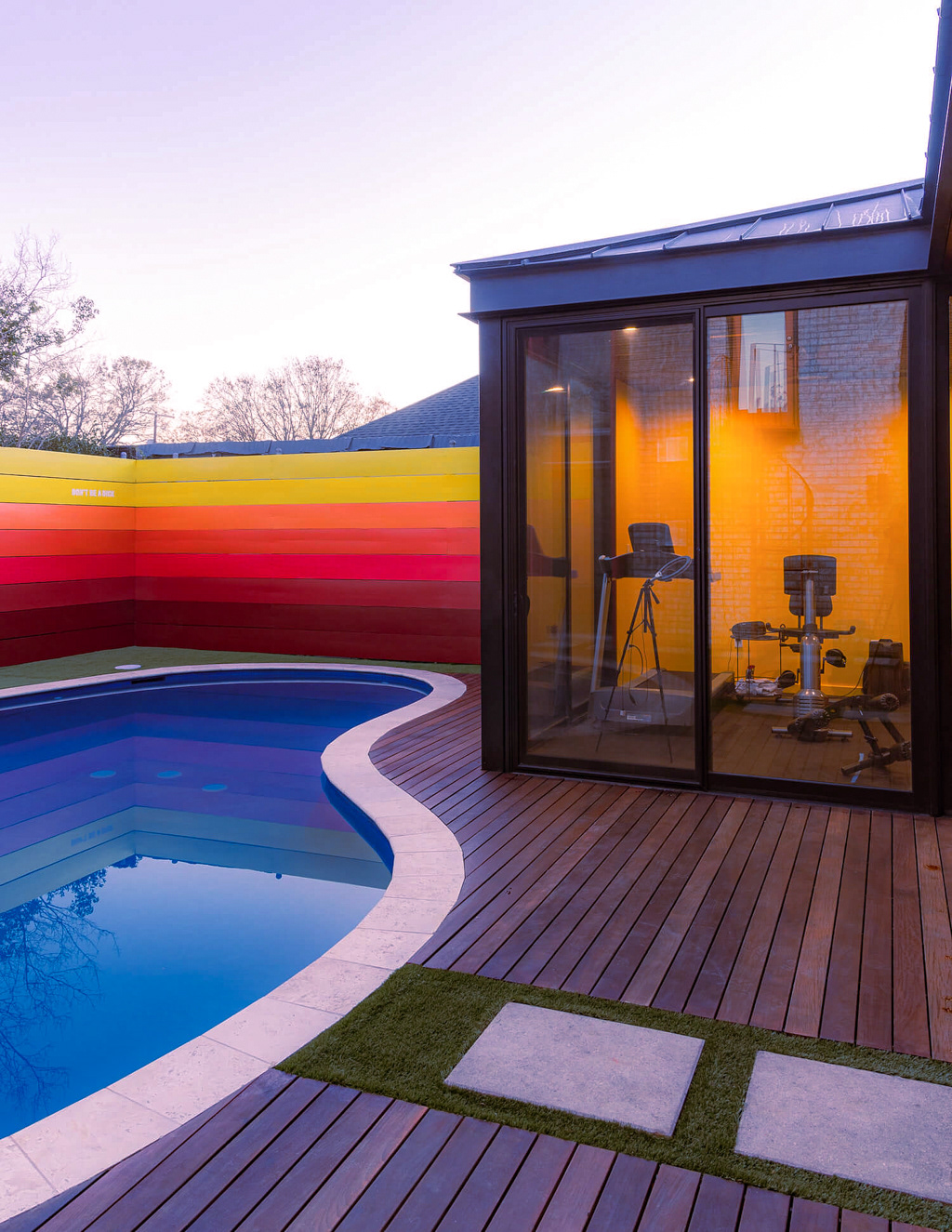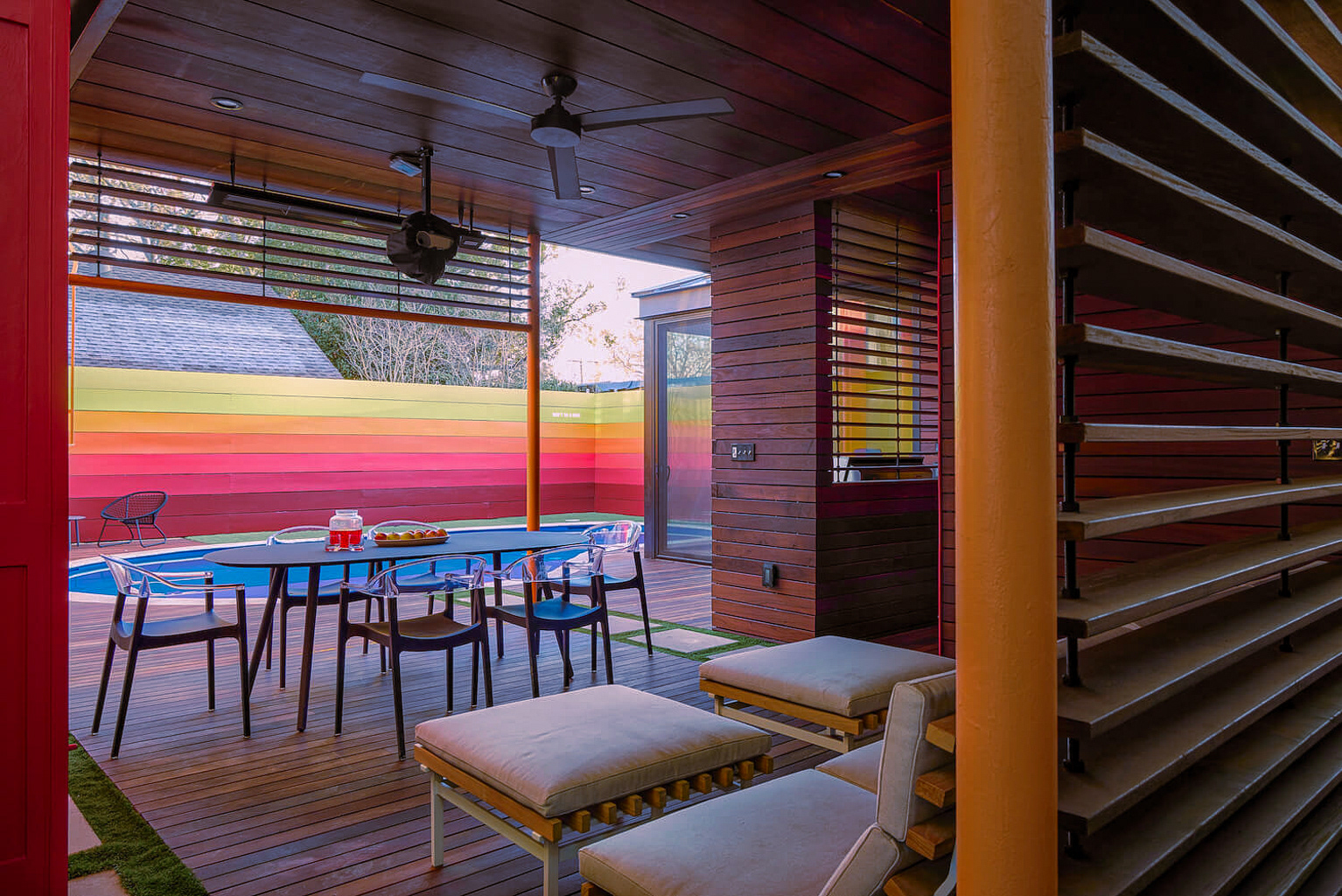 A dedicated bodybuilder and her husband wanted to create space for fitness and leisure as part of an extension to their mid-century modern home. The project’s goal was to maximize use of the backyard by providing a large gym, outdoor lounge space and outdoor kitchen. Bold colors are used in coordination with wood to express functional elements of both the existing home and cabana.