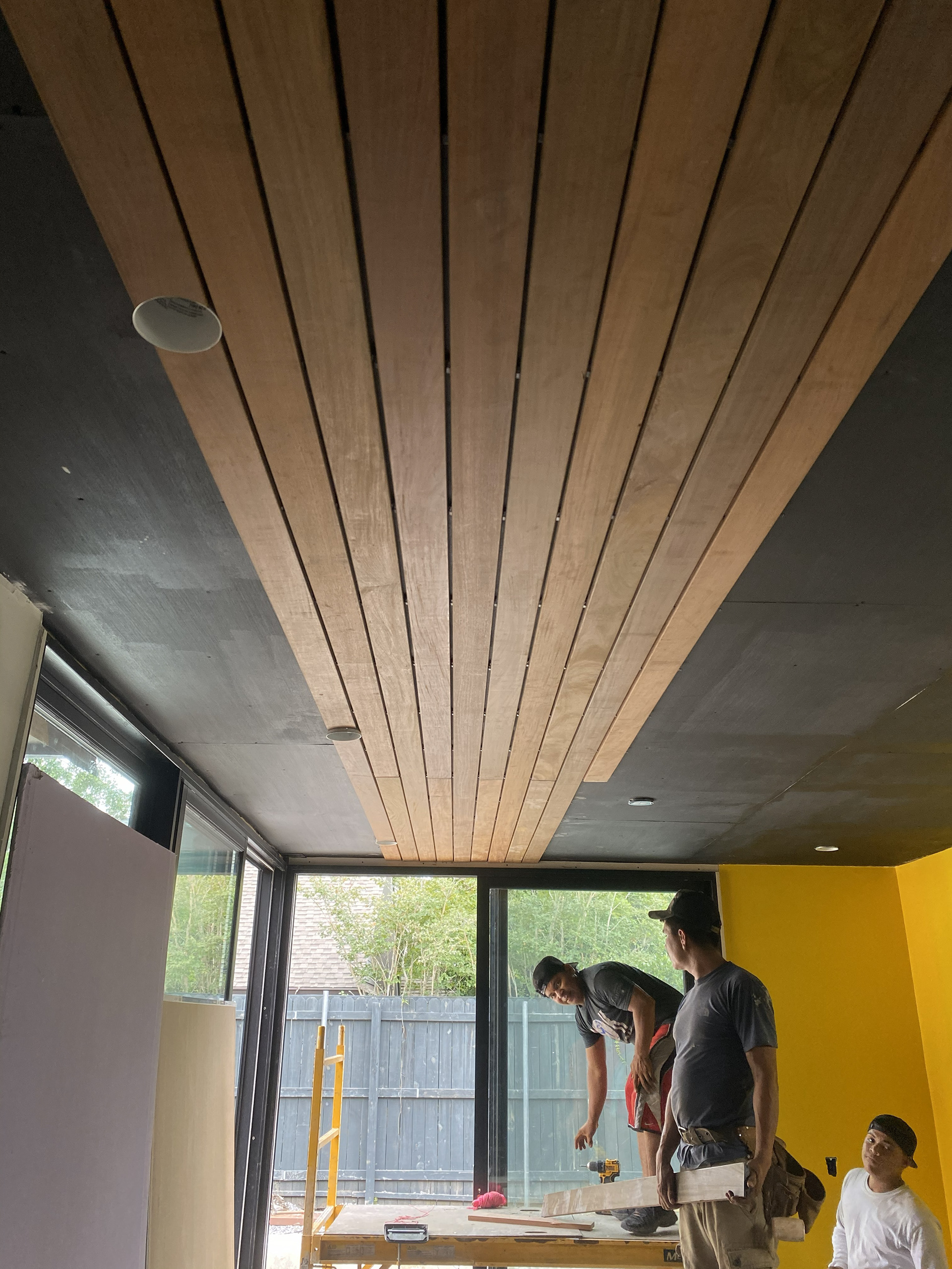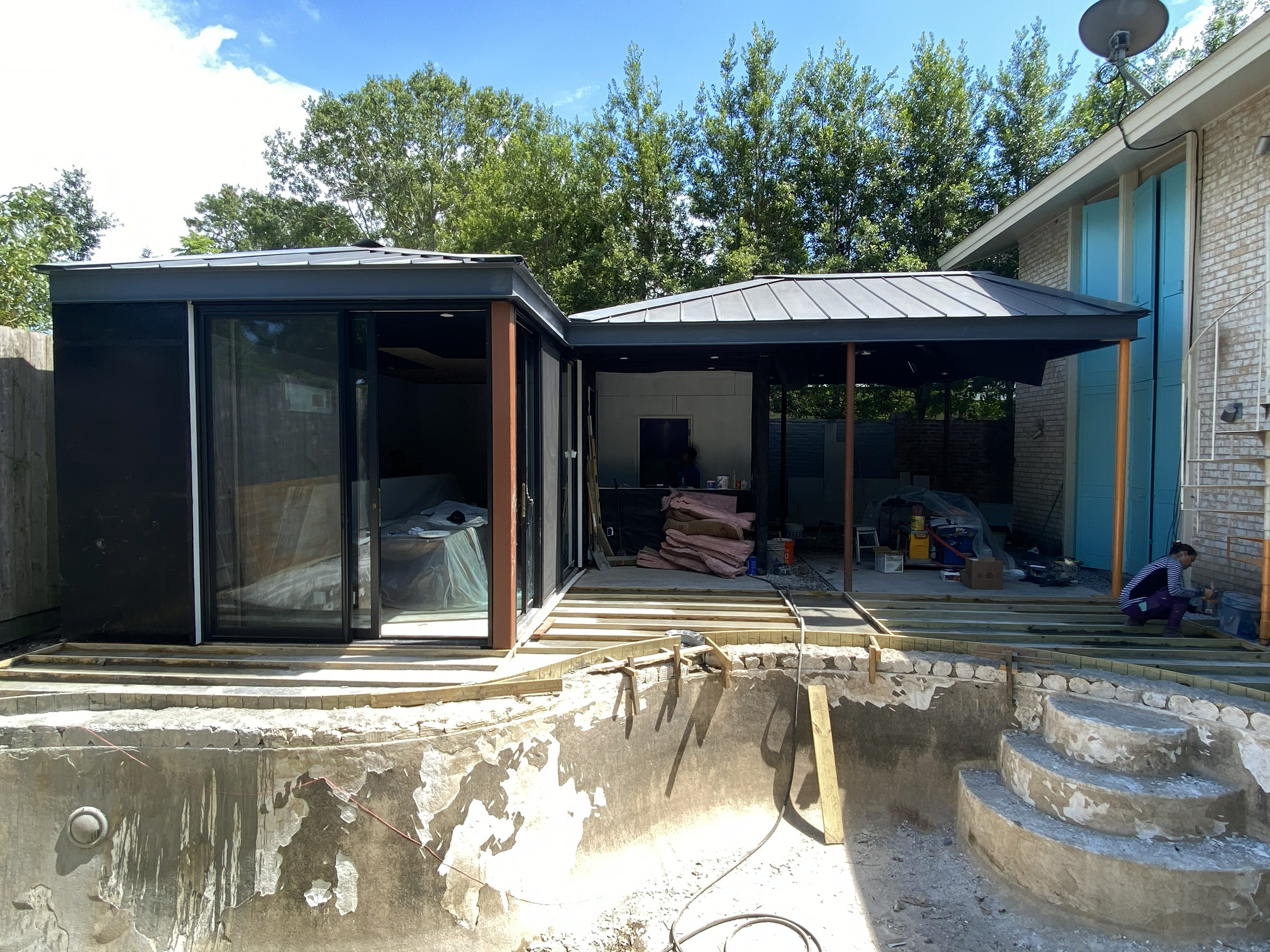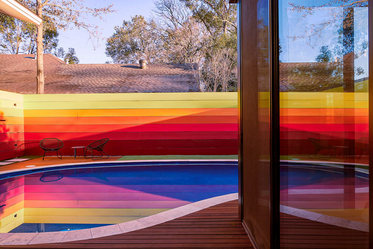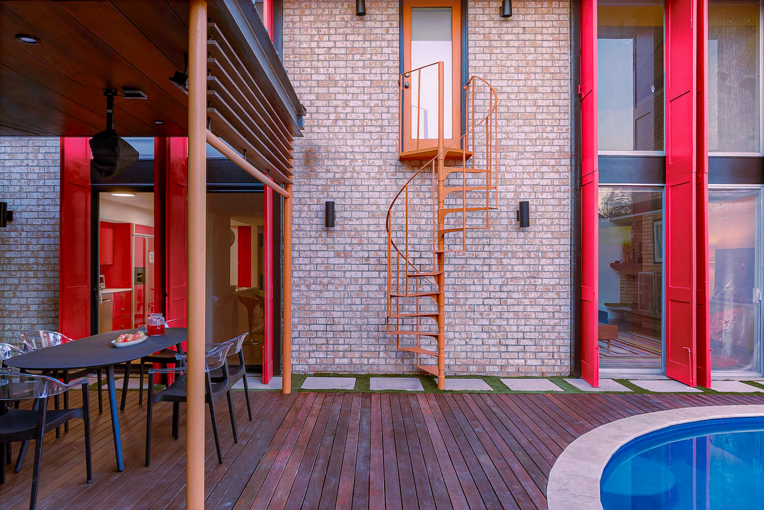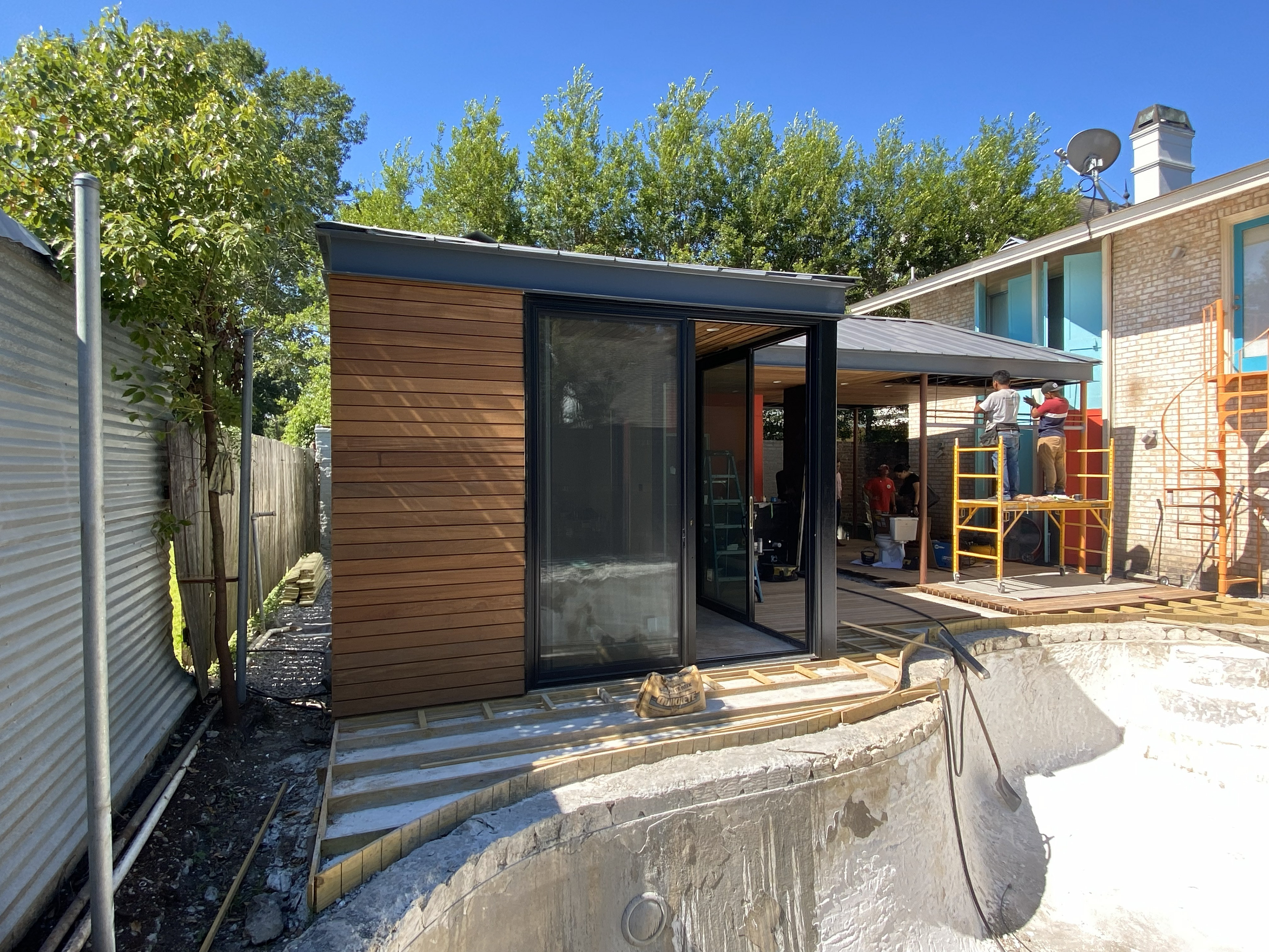 A dedicated bodybuilder and her husband wanted to create space for fitness and leisure as part of an extension to their mid-century modern home. The project’s goal was to maximize use of the backyard by providing a large gym, outdoor lounge space and outdoor kitchen. Bold colors are used in coordination with wood to express functional elements of both the existing home and cabana.