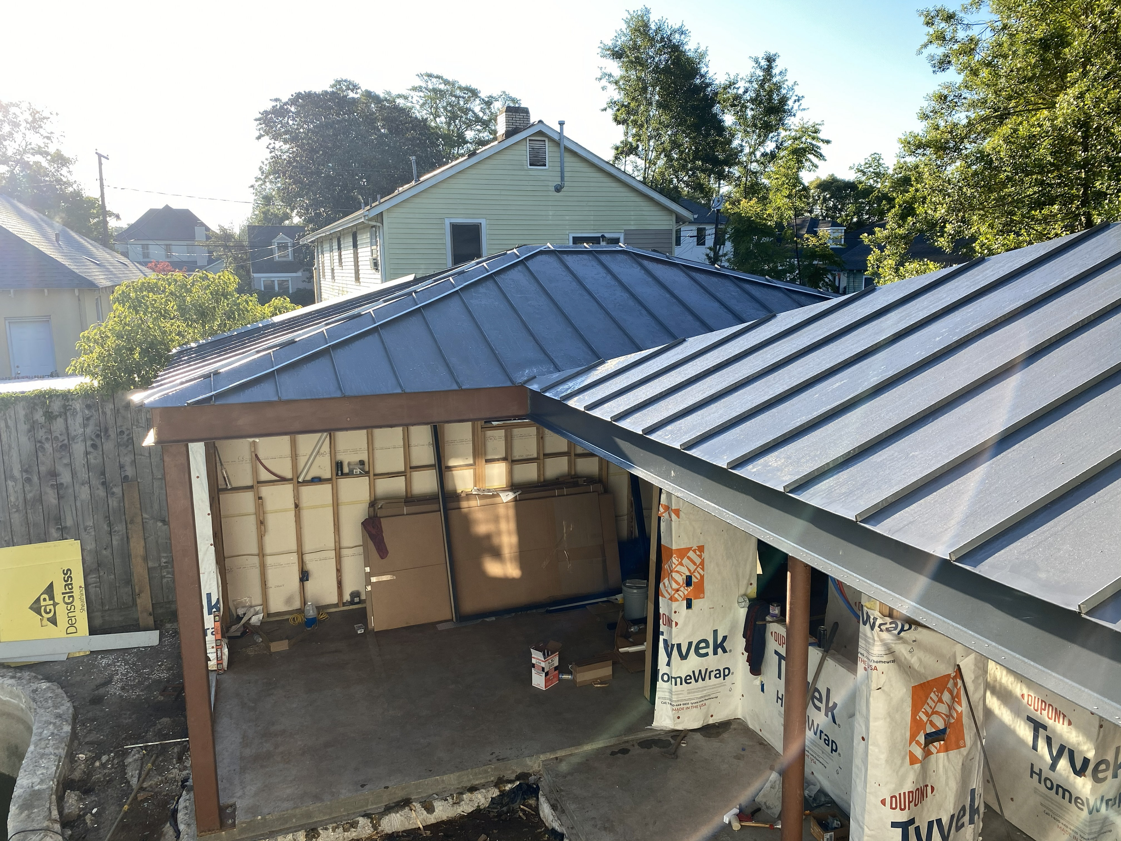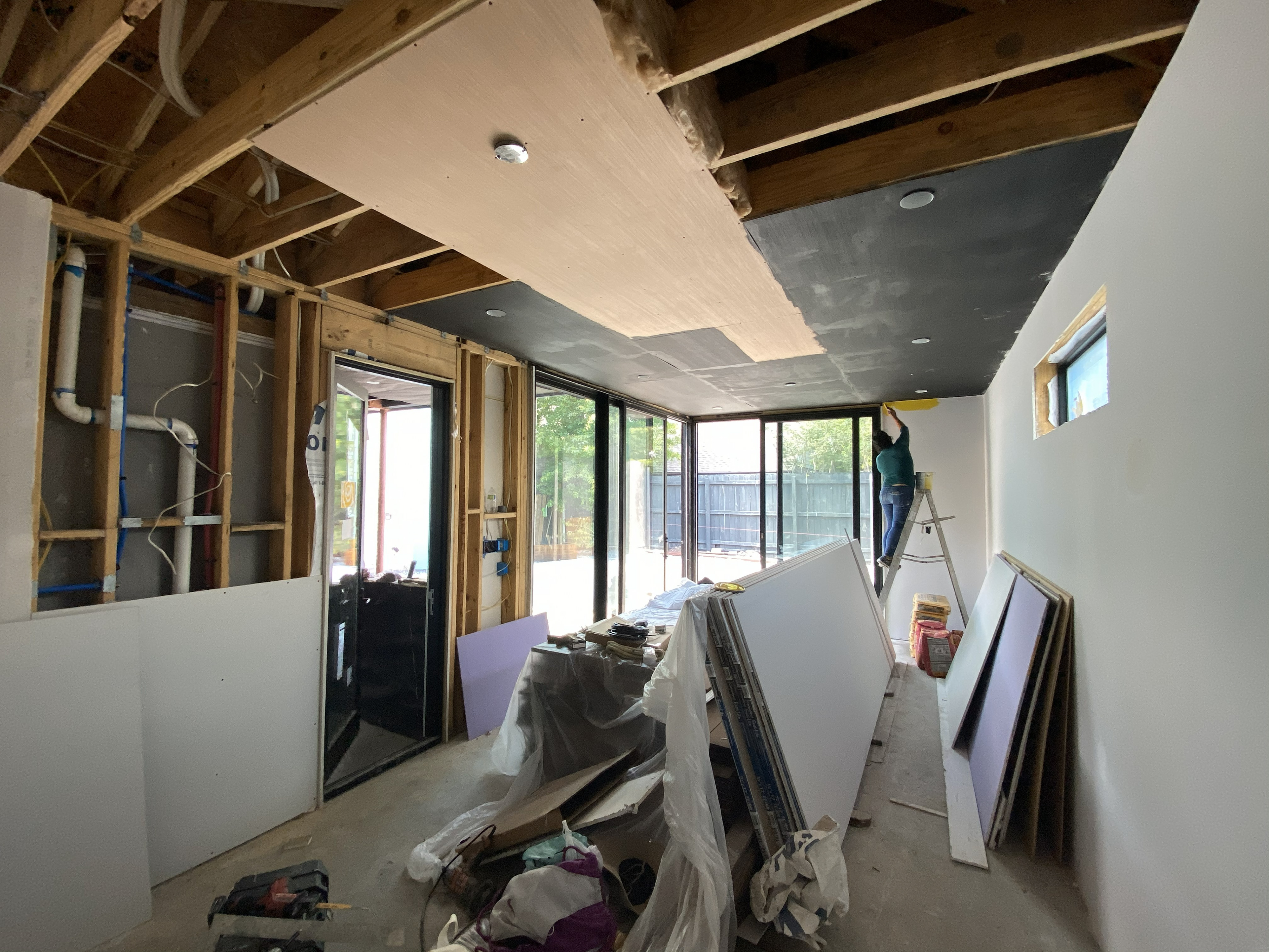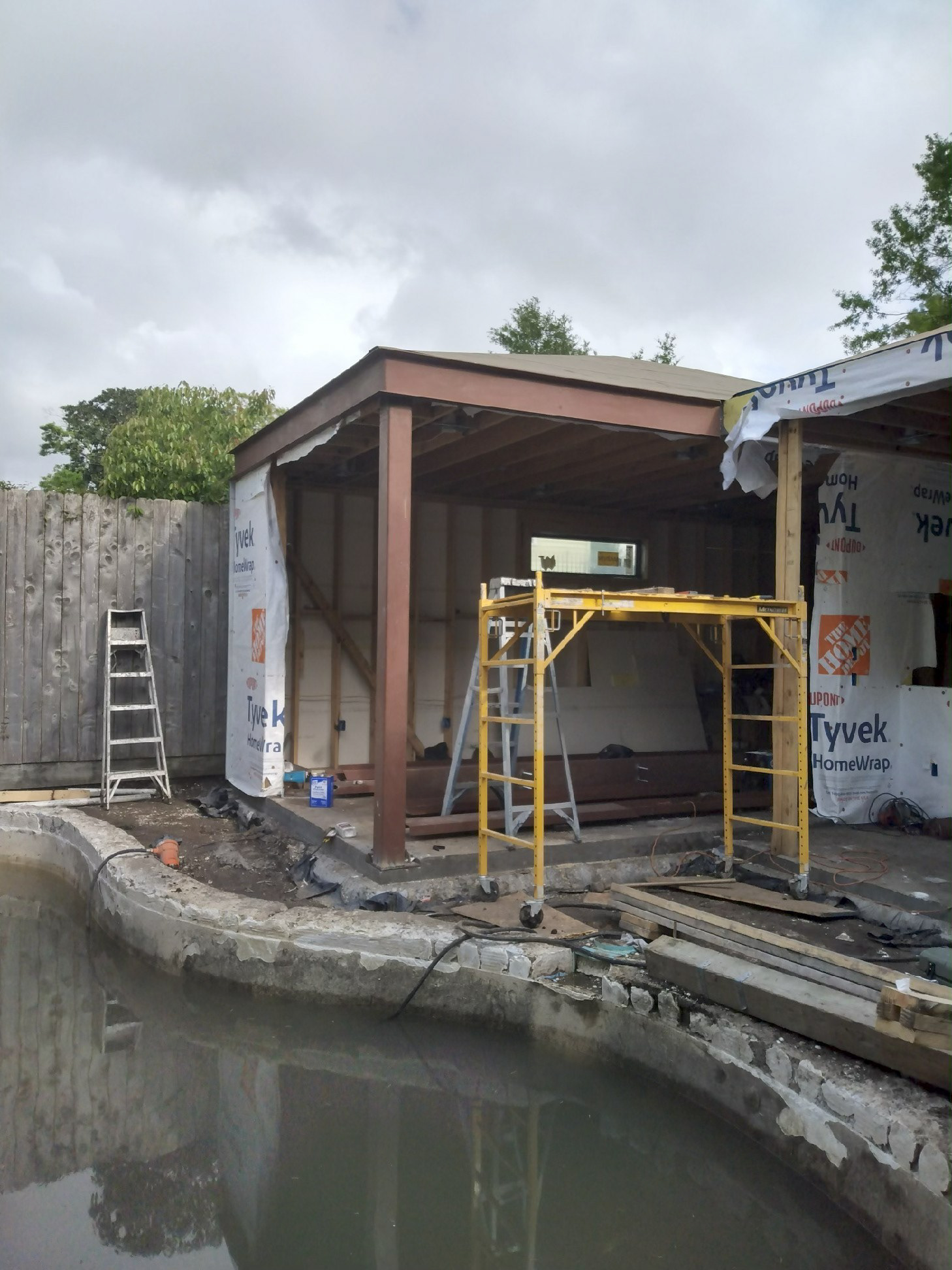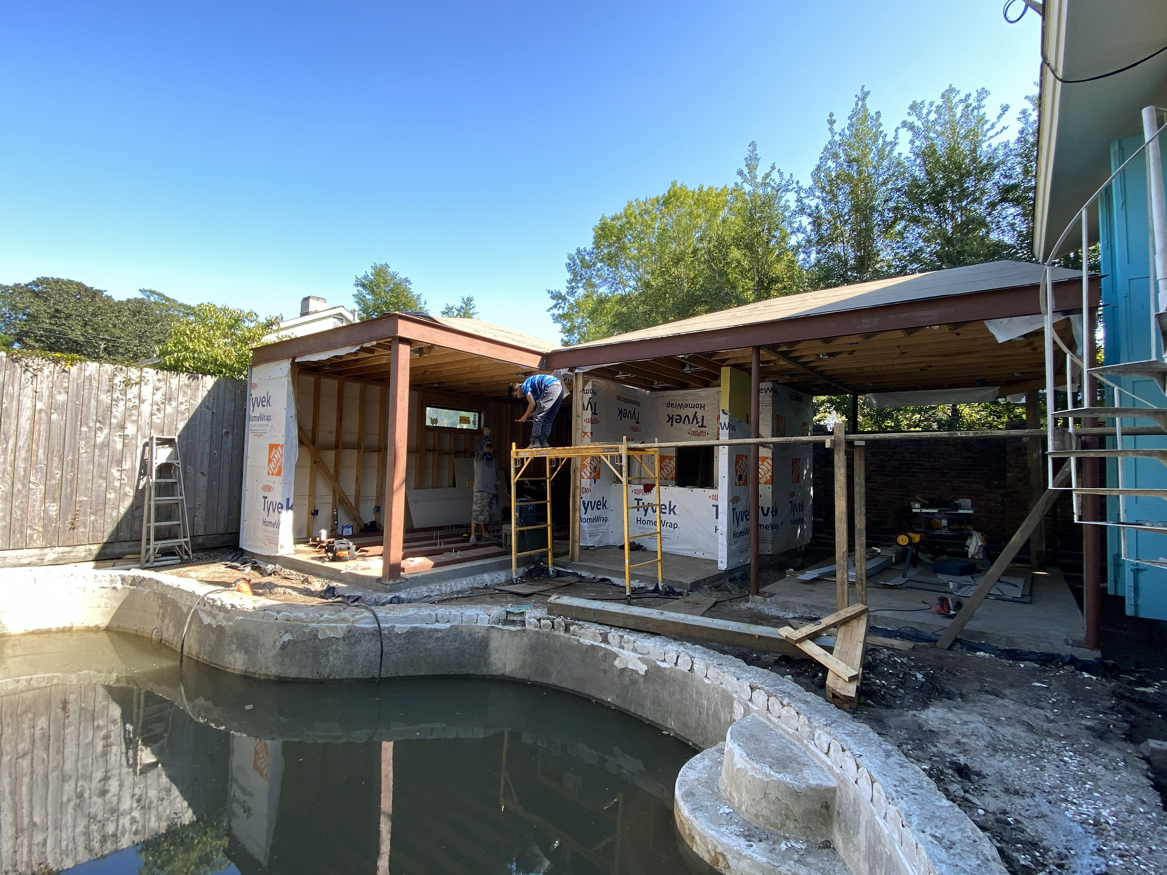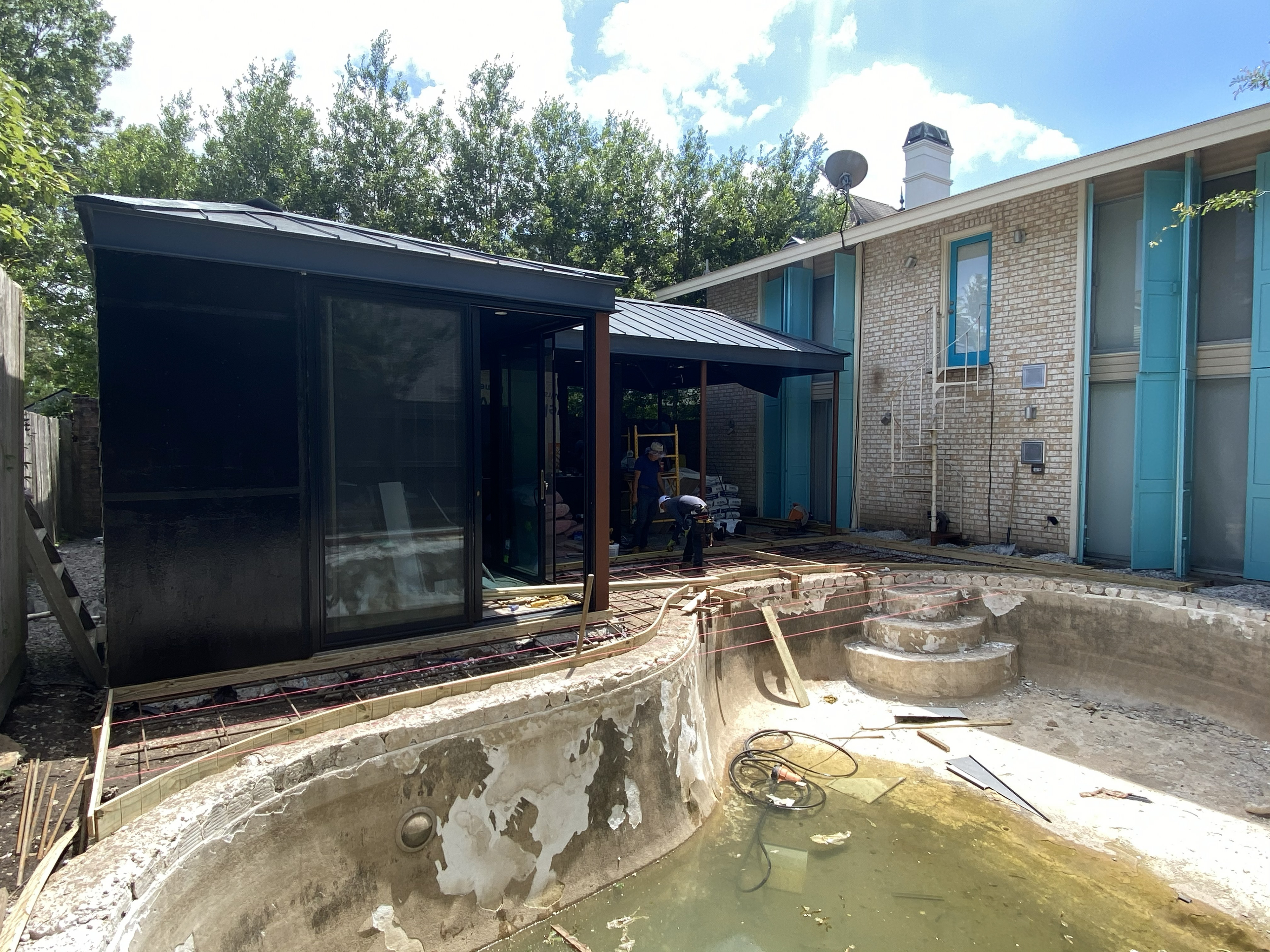 A dedicated bodybuilder and her husband wanted to create space for fitness and leisure as part of an extension to their mid-century modern home. The project’s goal was to maximize use of the backyard by providing a large gym, outdoor lounge space and outdoor kitchen. Bold colors are used in coordination with wood to express functional elements of both the existing home and cabana.